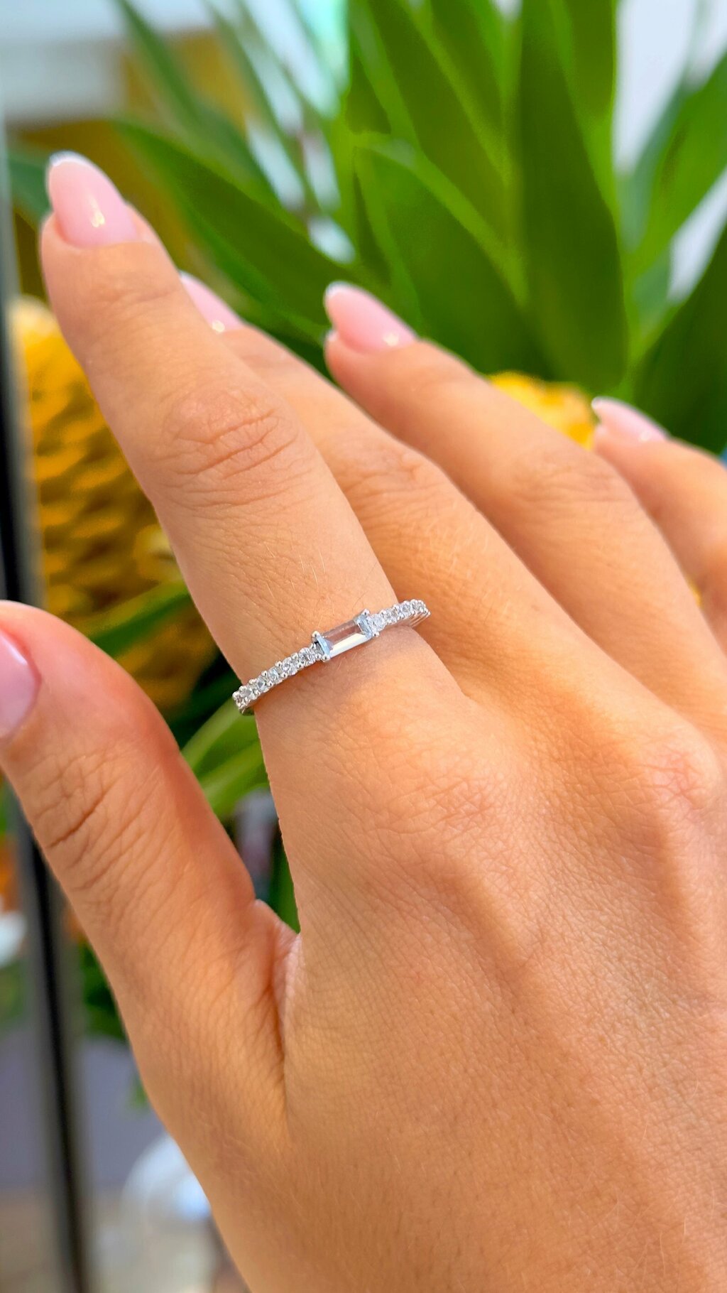 O Anel Meia Aliança com Cristal Água-Marinha e banho de Ródio Branco, é uma peça delicada e sofisticada, adicionando um toque de cor suave e brilho ao design clássico, perfeito para compor visuais elegantes.