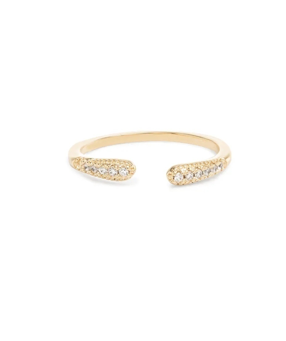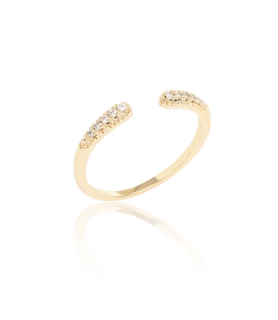 O anel fino aberto com meia linha de zircônias brancas, com banho de ouro 18k, é uma peça delicada e moderna, ideal para complementar produções minimalistas. Seu design elegante combina a sutileza das zircônias com a sofisticação do banho de ouro, resultando em um acessório leve e versátil.