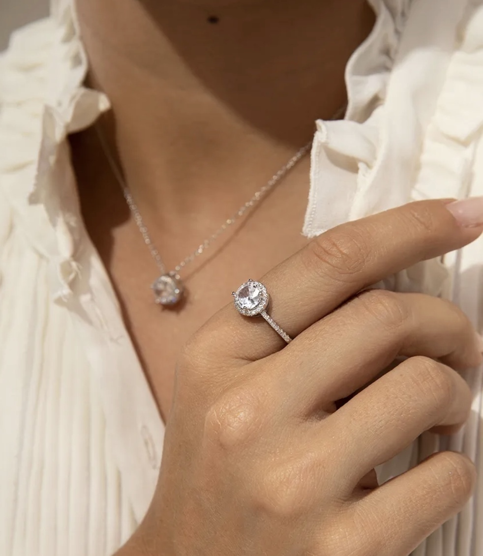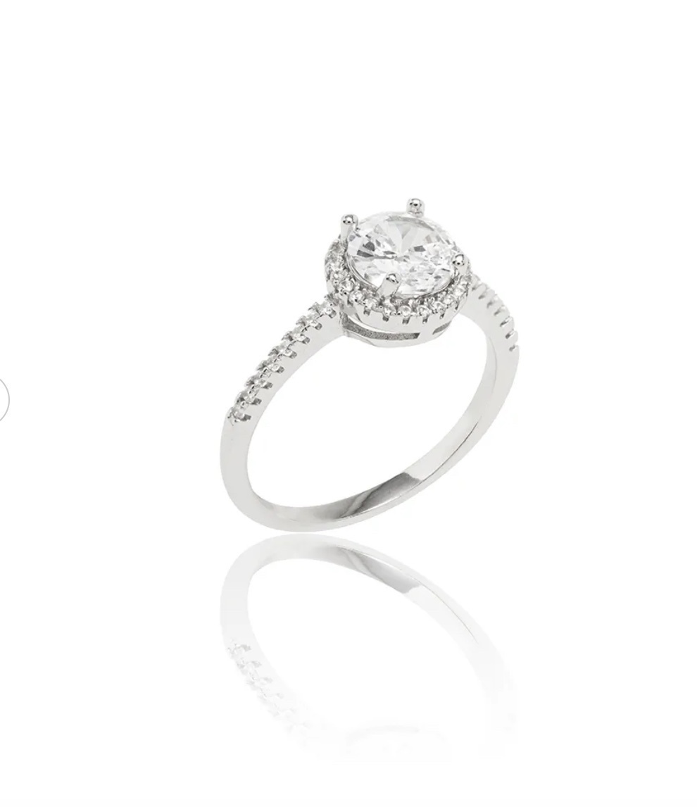 O anel solitário redondo com zircônia branca em cravação halo e prata 925 é uma peça clássica e extremamente elegante. Possui uma pedra central de zircônia branca de 7 mm, delicadamente cravada, e bordas adornadas com pequenas zircônias brancas que destacam ainda mais seu brilho.