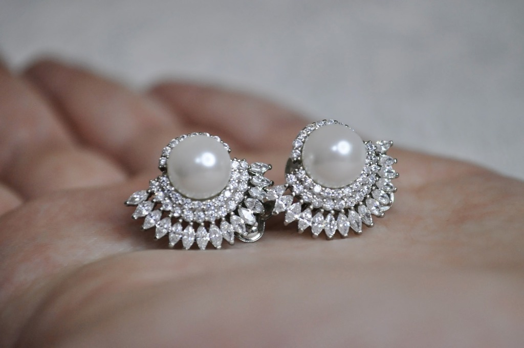 Brinco leque cravejado em zircônias com uma pérola central, banhado a ródio.