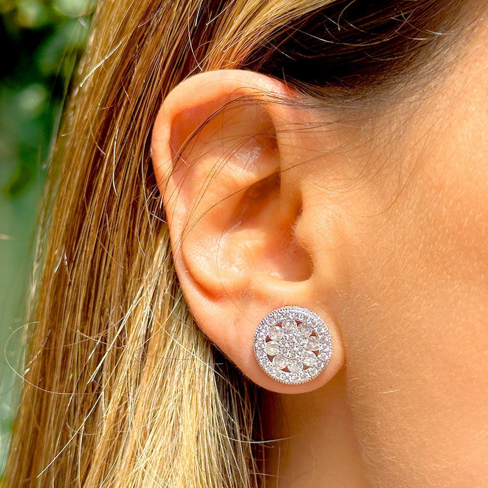 Brinco com design redondo que lembra uma roda com flor central inteiro cravejado de zircônias brancas e banho em ródio branco.