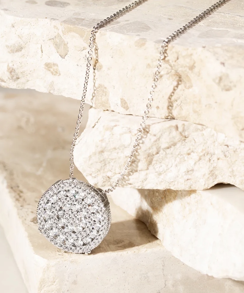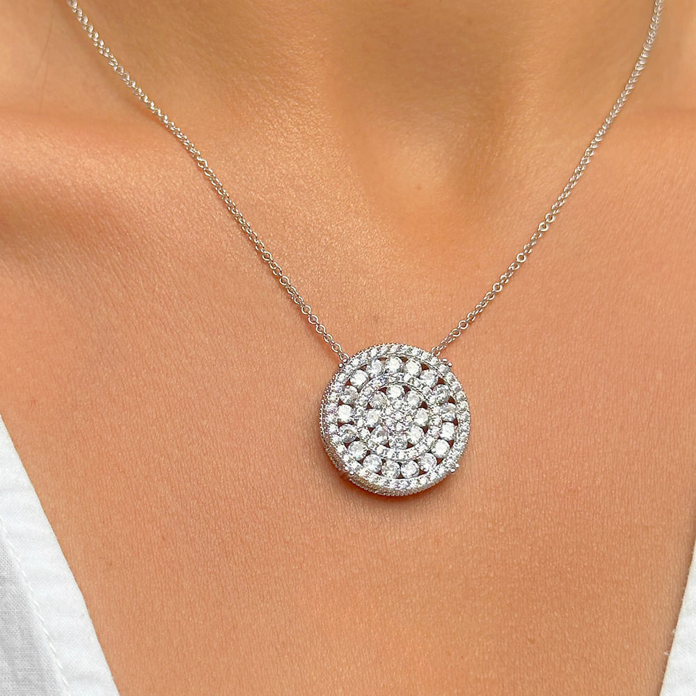 O colar todo cravejado de zircônias brancas e banho de ródio branco apresenta um design deslumbrante em forma de medalha que lembra uma roda e flor central, o contraste entre o design geométrico da medalha e a suavidade da flor central resulta em uma peça semelhante a alta joalheria, com fecho lagosta.