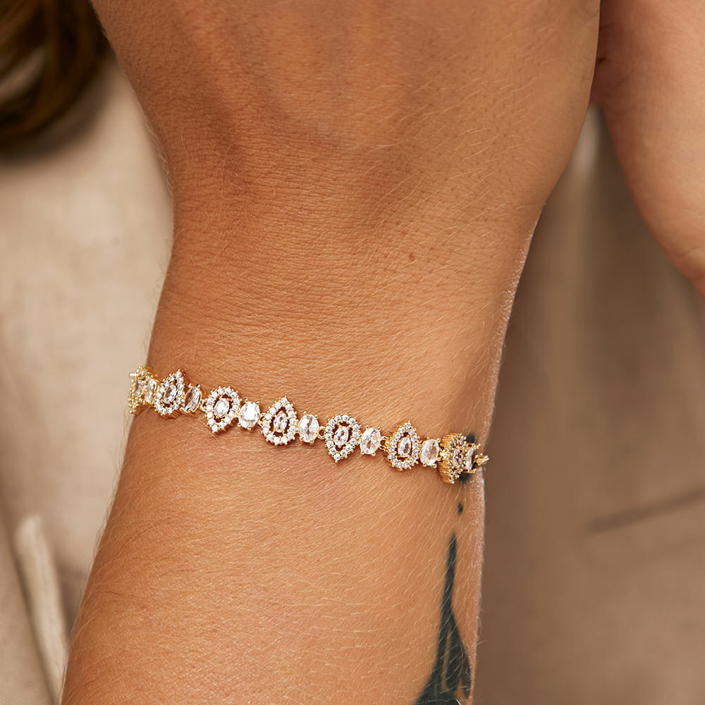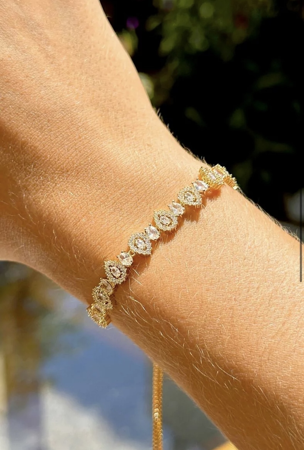 A pulseira regulável com gotas de zircônias brancas e zircônias ovais intercaladas, com banho de ouro 18k, é uma peça delicada e sofisticada. As zircônias em formatos de gotas e ovais adicionam um brilho encantador, enquanto o design ajustável oferece conforto e praticidade.