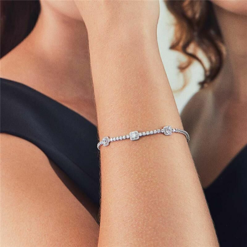 Pulseira riviera com 3 quadrados microcravejados e zircônias brancas redondas centrais e fecho gaveta. Ideal para um visual refinado. Feito em prata 925 com banho de ródio branco. O processo de banho da prata, faz com que a peça se torne ainda mais resistente ao efeito de oxidação.